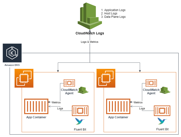 Below is the architecture diagram that shows the components that are involved in collecting logs and metrics from your EKS environment.
